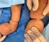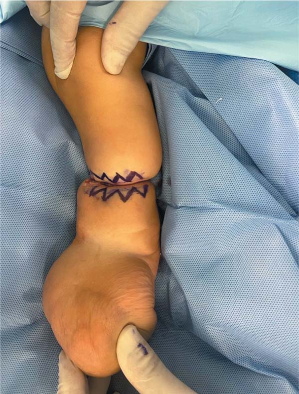 Constriction band excision and repair in the neonatal period is indicated in patients with severe vascular insufficiency or lymphatic congestion resulting in signs of critical limb ischemia.2