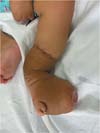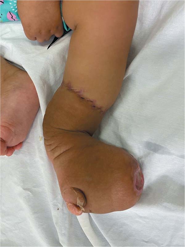 Our service admitted the patient after referral by the pediatric surgery team for evaluation and management (►Fig. 1). The patient presented with acrosyndactyly, shortening of the third, fourth, and fifth fingers, absence of the index finger of the right hand, a proximal constrictive band (Patterson grade III) in the middle third of the right arm, shortening of the forearm with severe distal bone fusion, and adhesion between the right hand and the thorax. There was no evidence of lymphedema of the right hand. A circumferential, deep amniotic band was evident in the distal third of the left leg, grade III, extending close to the bone region, with symbrachydactyly due to the shortening of the toes of the left foot. Additionally, the same left lower limb with the amniotic band presented a large distal lymphedema on the dorsum of the left foot but with no signs of vascular compromise.