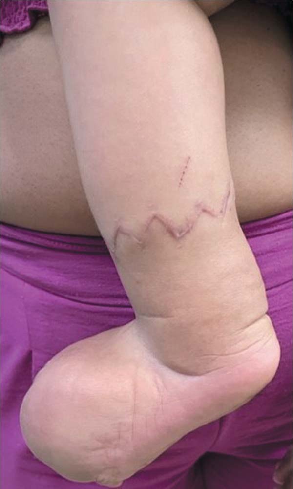 The patient showed significant improvement in vascular congestion, especially 4 months after surgery. There was no evidence of constriction or depression in the region of the amniotic band on the left leg, with total leveling of the skin and subcutaneous tissue with the rest of the limb. As moderate lymphedema persisted in the left foot, we recommended elastic stockings with mild compression up to the left knee and lymphatic drainage sessions. The surgical scar presented moderate hypertrophy in the first 6 months, and gradual improvement was noted with local massages and the use of silicone tapes.