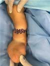Patterson classified congenital constrictive bands according to their severity and clinical repercussions as follows: grade I, presence of simple constriction rings with normal extremity distal to these lesions; II, presence of a ring with distal atrophy and lymphedema; III, presence of ring with syndactyly in the affected extremities; and IV, presence of a ring leading to amputation.2,8