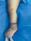 The operative time was 52 minutes, and we released the tourniquet on the left lower limb after finishing the dressing with petrolatum topical gauze (Adaptic, Systagenix), hydrophilic cotton, and bandaging. The total tourniquet time was 58 minutes. At the end of the procedure, we tested the distal perfusion, observing a capillary refill time lower than 2 seconds in the toes of the left foot. The patient remained hospitalized for 4 days with her leg elevated in bed. She presented significant lymphedema at the dorsum of the left foot, with peak edema at 48 hours. The patient was discharged after 4 days with analgesic treatment and no antimicrobials and scheduled a return visit within 3 days.
