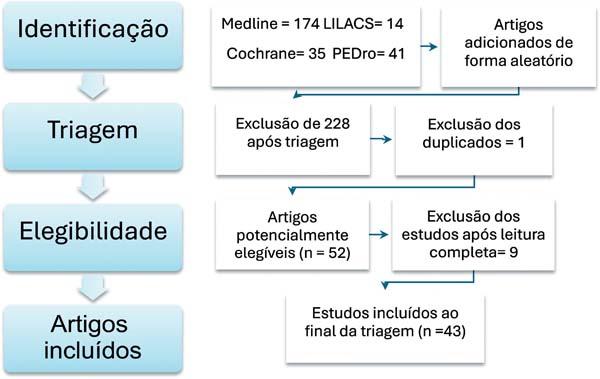Na fase de descobrir, realizou-se a busca de anterioridade e a busca na literatura: a pesquisa de anterioridade foi feita nos principais motores de busca da internet, como Google, Yahoo e Bing, e no website do mestrado profissional mencionado anteriormente; já a busca na literatura foi feita nas bases de dados Medline, LILACS, Cochrane e PEDro, utilizando as estratégias de buscas com os Descritores em Ciências da Saúde/Medical Subject Headings (DeCS/MeSH) apresentados na ►Tabela 1 para compilar as evidências e os conteúdos científicos sobre o tema. Aplicaram-se critérios de elegibilidade, incluindo publicações dos últimos 10 anos (entre 2014 e 2024), em português ou inglês, que abrangiam desenhos de estudos primários e secundários, como revisões sistemáticas com ou sem metanálise, ensaios clínicos randomizados ou quase randomizados, diretrizes e normas técnicas pertinentes ao tema, coortes prospectivas ou retrospectivas e séries de casos. Os critérios de exclusão foram: estudos em que a casuística incluía pacientes menores de 18 anos, estudos em animais, estudos de caso-controle e relatos de caso. Foram excluídos estudos duplicados ou não relacionados diretamente com o tema após sua leitura completa.