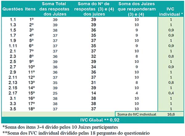 Fig. 2 - Valores global e individual dos juízes especialistas do índice de validade de conteúdo (IVC) pelo método Delphi.