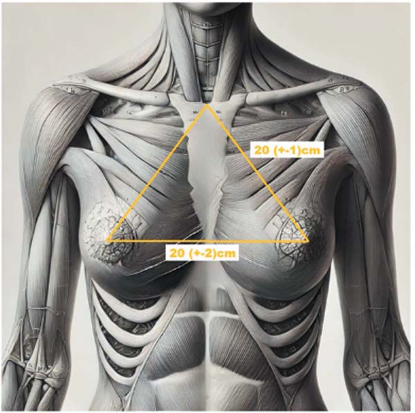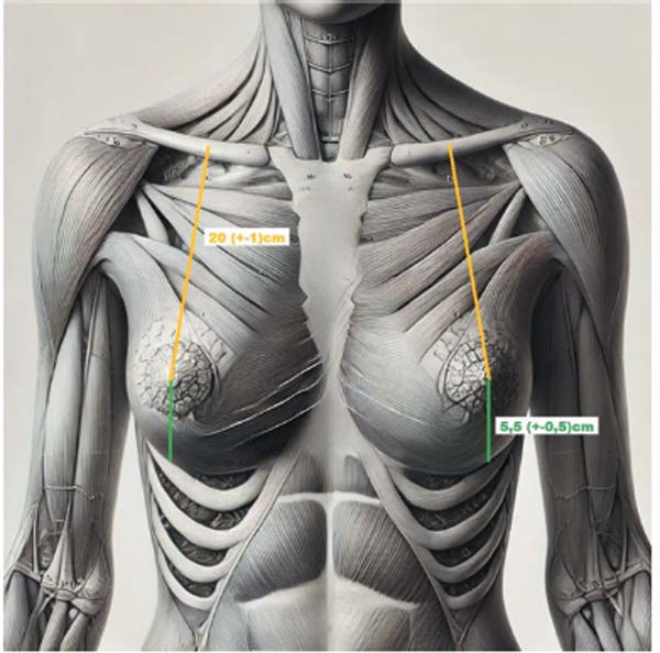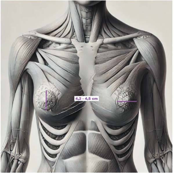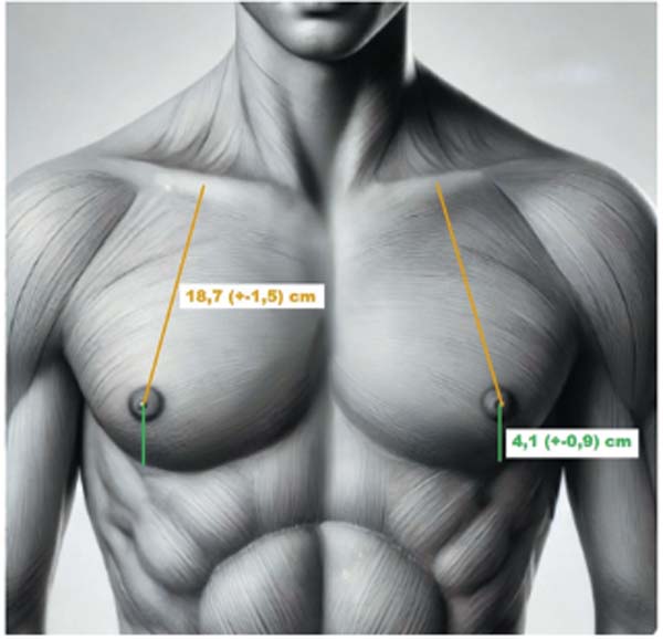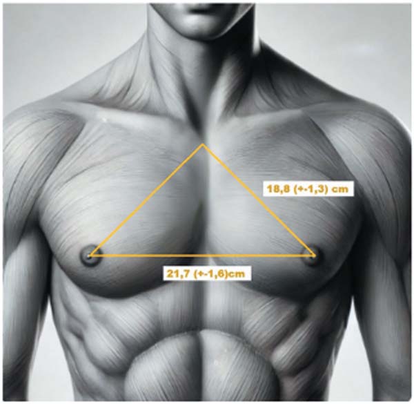 Os padrões antropométricos do CAP feminino servem como guias fundamentais em cirurgias de aumento, redução e reconstrução mamária,1–3 com validação em diferentes populações. Esses estudos identificam proporções específicas, como a distância ideal do mamilo à fúrcula esternal e ao sulco inframamário (SIM), amplamente utilizadas na prática cirúrgica. Por outro lado, o CAP masculino apresenta desafios únicos, e demanda uma abordagem que considere a ausência de volume mamário e a necessidade de harmonia em um tórax plano. Trabalhos recentes4,5 sugerem a utilização de algoritmospreditivos para otimizar o posicionamento e as dimensões do CAP masculino com base em medidas individuais.