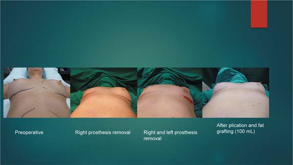 We performed a permanent removal of the implants and complete removal of capsules in the subglandular plane. Fat grafting and breast assembly with fan-shaped, concentric sutures in the breast parenchyma resulted in proper NAC projection, with its position fixed in the pectoral fascia to prevent residual ptosis. The case progressed satisfactorily, with no outcome loss at follow-up.