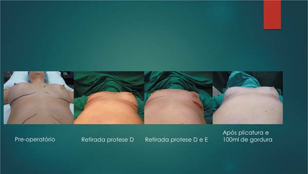 No presente caso, foi realizada a retirada definitiva dos implantes e remoção completa das cápsulas no plano subglandular. Mediante lipoenxertia e montagem da mama com pontos concêntricos no parênquima mamário em formato de asterisco, resultando em boa projeção do CAM, tendo sua posição fixada na fáscia peitoral prevenindo a ptose residual. O caso evoluiu de maneira satisfatório sem perda de resultado no acompanhamento.