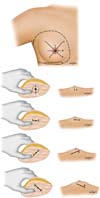 A paciente optou pelo explante definitivo, sendo realizada a retirada dos implantes e respectivas cápsulas, usando a mesma incisão no sulco mamário inferior, 2 cm maior que a original. Foi realizado 100 ml de enxerto de gordura em cada mama, periférico e subcutâneo, preservando a glândula mamária intacta. O remodelamento do tecido mamário foi feito através de plicatura interna em asterisco no centro das duas mamas, iniciando na região posterior ao complexo areolomamilar (CAM) para reconstruir a projeção das mamas. Após finalizada a plicatura, foi fixada a projeção interna do CAM na parede torácica para minimizar a ptose subsequente das mamas (►Fig. 1,3). Com 1 ano de acompanhamento, a paciente declarou-se satisfeita com a projeção e formato da mama (►Fig. 2).