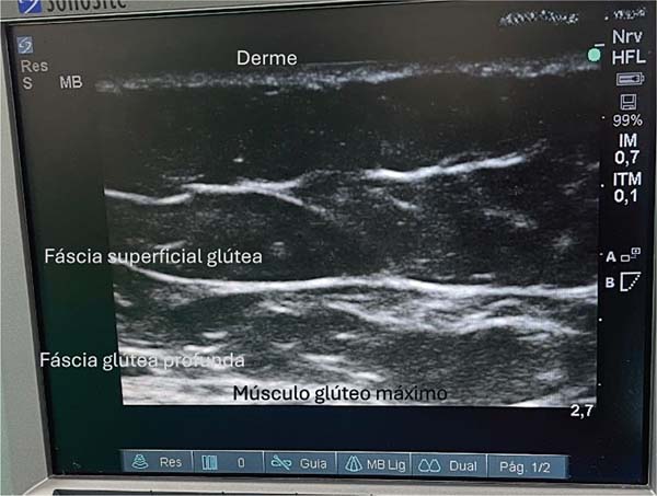 Este estudo se baseia na utilização do ultrassom com a metodologia SIME,7 que possibilita a observação direta da lipoenxertia guiada por ultrassonografia. Esse método permite a identificação precisa das divisões e compartimentos anatômicos da região glútea, requer um conhecimento detalhado da anatomia local, e garante que o enxerto de gordura seja depositado exclusivamente no plano subcutâneo, acima da fáscia muscular. Essa visualização direta14 proporciona um nível superior de segurança, pois permite monitorar em tempo real o posicionamento do enxerto de gordura, o que evita a aplicação às cegas.