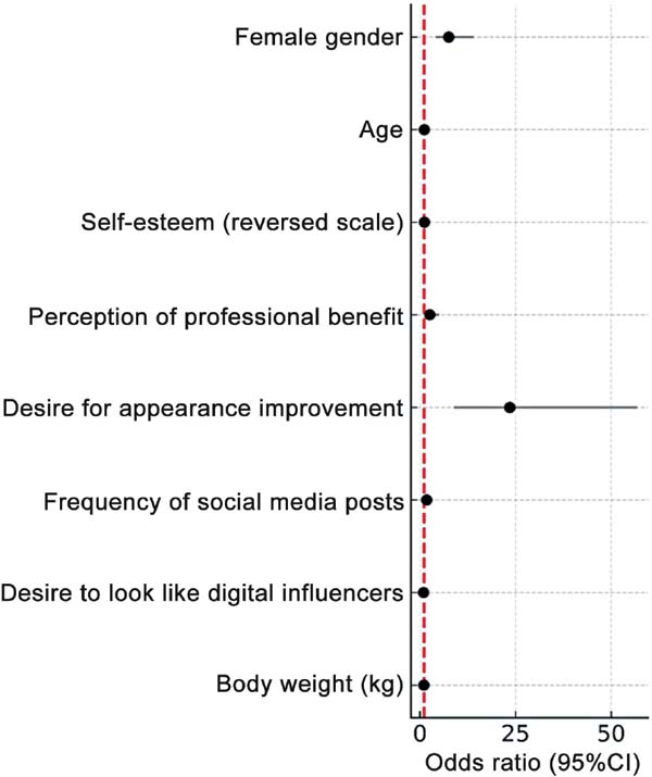 Results Most participants were female (68.98%) and aged between 21 and 25 years old (45.87%). Although 89.1% had never undergone plastic surgery, 58.75% expressed interest in doing so. The main predictors of surgical intention were: desire to improve appearance (odds ratio [OR] p < 23.5; p<0.001), female sex (OR=7.6; p<0.001), perception of professional benefit (OR=2.56; p<0.014), frequency of social media posts (OR=1.76; p<0.012), age (OR=1.12; p¼0.002), and low self-esteem (OR =1.14; p<0.001). The multivariate model showed excellent discriminatory power (area under the curve [AUC]=0.89).