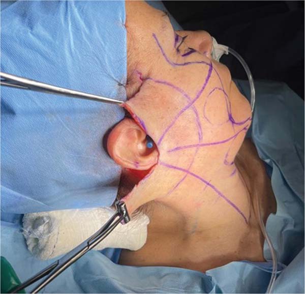 1. Antissepsia e marcação bilateral característica do facelift eutrófico.