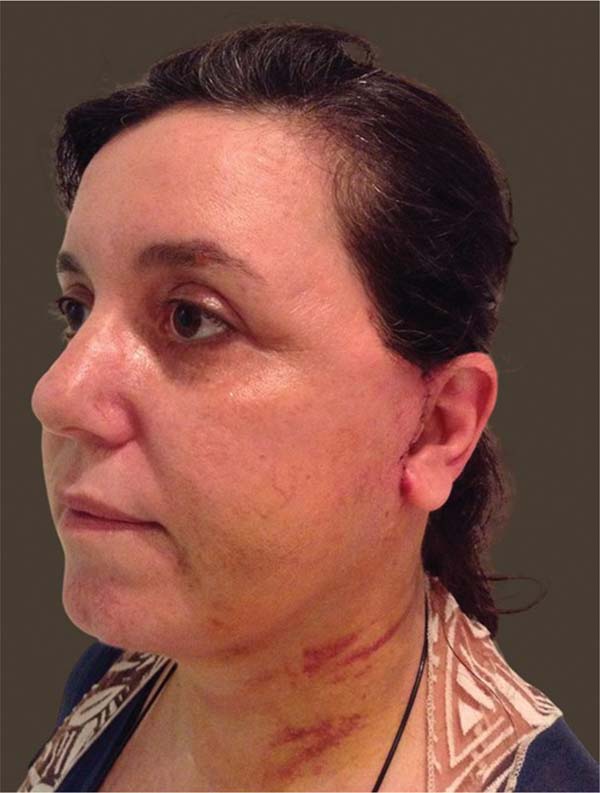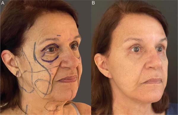 A técnica de facelift eutrófico diferencia-se da ritidoplastia convencional devido ao descolamento mínimo da pele, com foco na tunelização subdérmica. Esse procedimento preserva as trabéculas vasculonervosas, resultando em uma pele com aparência nutrida, evitando o aspecto artificial e desvitalizado que pode acontecer em outras técnicas.6 Além disso, essa abordagem garante um reposicionamento mais global dos tecidos e estruturas que sofrem migração anatômica devido ao envelhecimento,10,11 uma vez que a preservação das trabéculas permite uma tração não só do retalho dermocutâneo mas também das estruturas profundas. Dessa maneira, os resultados com a técnica de facelift eutrófico foram satisfatórios, naturais e seguros.