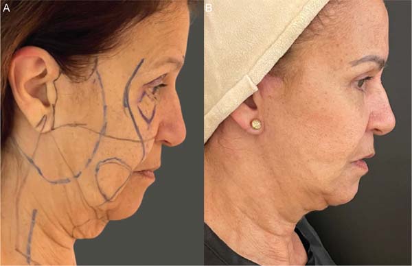 O envelhecimento da face é considerado um dos principais desafios da cirurgia estética.1 O contorno facial pode sofrer modificações anatômicas estéticas e funcionais decorrentes do envelhecimento cronológico e da influência de fatores externos, resultando em alterações fisiológicas e psicológicas no paciente.2 Durante esse processo complexo, os compartimentos de gordura sofrem alteração em seu volume, resultando em espessura reduzida de gordura subcutânea. Simultaneamente, ocorre uma redução da massa muscular enquanto os ossos perdem volume e projeção. Essas modificações combinadas contribuem para a flacidez da pele sobrejacente e a formação de rugas.3
