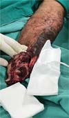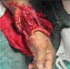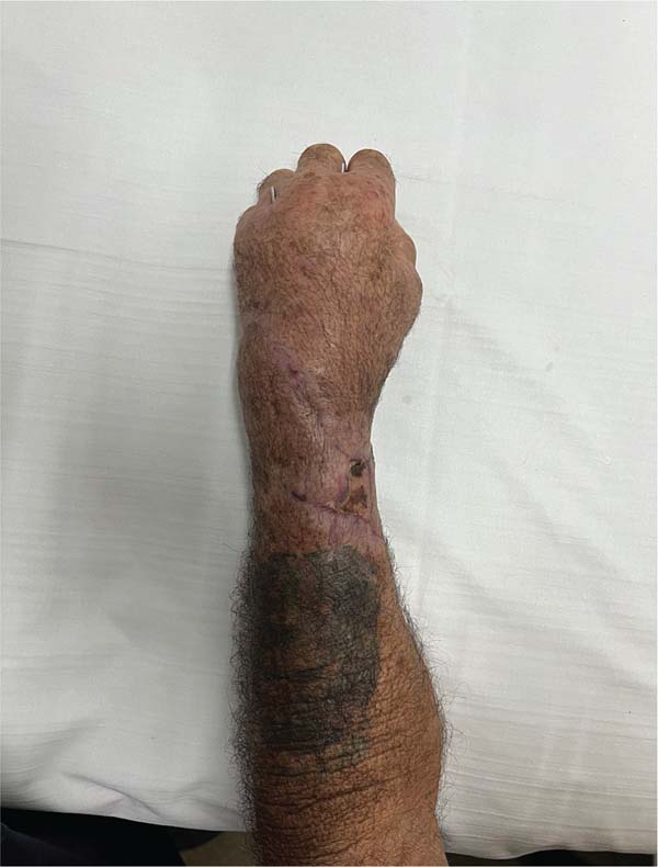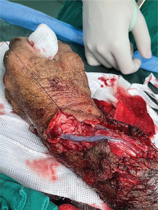 A 56-year-old patient (IPB), male, married, born and living in Fortaleza, was admitted to the hospital following an accident involving a saw in a butcher shop. He presented with a total amputation of his left hand at the wrist level with bone and tendon exposure. The patient arrived with a tourniquet on his left arm and his amputated hand in an ice-filled contain-er. He reported that the accident had occurred approximately 40 minutes before. On examination, he was stable but mod-erately pale due to significant blood loss, with no loss of consciousness, and a heart rate close to 110 bpm, indicating grade 2 hypovolemic shock. There were no signs of abrasions or trauma to other limbs (►Figs. 1-3).