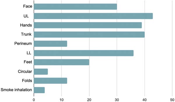 The distribution of burn-affected anatomical sites was broad, with the highest incidence in the upper limbs (43 cases; 53.75%), followed by the trunk (40 cases; 50%) and the hands (39 cases; 48.75%). Facial burns were observed in approximately one-third of cases (37.5%), while the lower limbs and feet were involved in 45% and 25% of patients, respectively. In addition, areas such as the perineum, folds, and circular burns were affected to a lesser extent, with 12 (15%), 12 (15%), and 5 cases (6%), respectively. Smoke inhalation was a complication observed in 5% of patients (► Fig. 1).