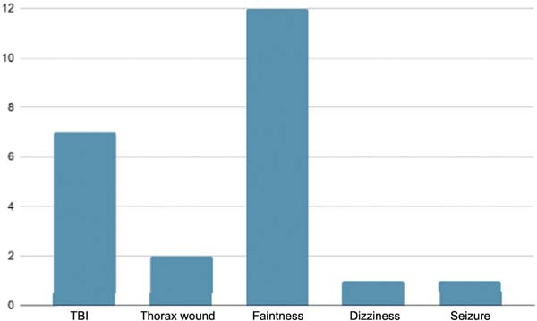 The most frequently burn-associated trauma was fainting, with 12 cases, since the pain resulting from a burn can overstimulate the vagal system. The autonomic nervous system’s response leads to decreased blood pressure and reduced blood flow to the brain, causing fainting.25 TBIs were also frequent, with seven cases, potentially resulting from accident-induced panic, causing disorientation and/or loss of balance. In industrial or household environments, explosions involving flammable fluids, gases, or chemicals can cause both burns and TBI.