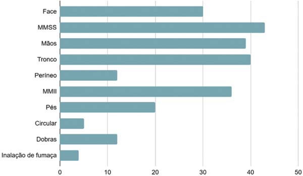 A distribuição das áreas afetadas pelas queimaduras foi ampla, com maior incidência nos membros superiores, com 43 casos (53,75%), seguidos das mãos (39 casos; 48,75%) e do tronco (40 casos; 50%). A face foi afetada em cerca de um terço dos casos (37,5%), enquanto os membros inferiores e os pés registraram 45% e 25% de acometimento, respectivamente. Além disso, áreas como o períneo, as dobras e queimaduras circulares foram afetadas em menor intensidade, com 12 casos (15%), 12 casos (15%) e 5 casos (6%), respectivamente. A inalação de fumaça foi uma complicação observada em 5% dos pacientes. Os dados estão ilustrados na ► Fig. 1.