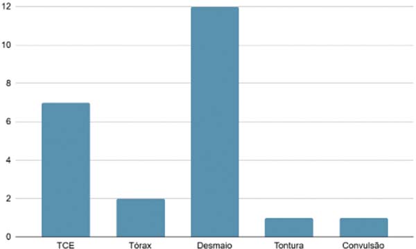 O trauma mais associado foi o desmaio, com 12 casos, uma vez que a dor associada à queimadura pode superestimular o sistema vagal. A resposta do sistema nervoso autônomo leva à diminuição da pressão arterial e à redução do fluxo sanguíneo para o cérebro, resultando em desmaio.25 OTCE também teve frequência expressiva, com 7 casos, possivelmente associado ao pânico pelo acidente, com desorientação e ou perda de equilíbrio. Em ambientes industriais ou domésticos, explosões envolvendo líquidos inflamáveis, gases ou substâncias químicas podem causar queimaduras e TCE simultaneamente.