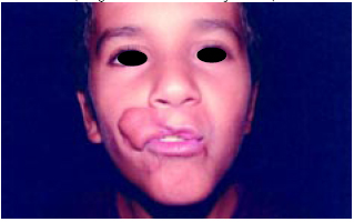 Figura 5 - Infecção por MARSA, exposição óssea e perda dos músculos elevador do lábio superior, zigomático (observar segmento superior à direita assimétrico em relação ao lado esquerdo) e segmento inferior do orbicular do olho.