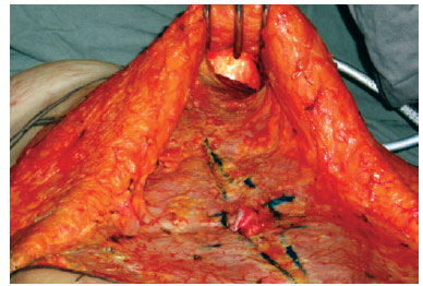 A route of approximately 6 cm width was extended towards the central breast, in the supra-aponeurotic plane. The retroglandular space was detached with an electric scalpel connected to a protractor; the procedure was performed under direct vision using a long lighted retractor (Figure 2). This enabled good visualization of the area and efficient dissection (Figure 3).