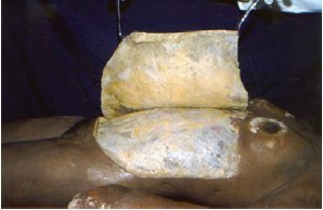 Figura 4 - Peça do hipogástrio de cadáver com incisão parcial da camada lamelar rebatida, expondo a bolsa adiposa.