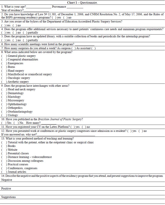 RESULTS: Eighteen residents (age range, 25-52 years; 13 [72.2%] men and 5 [27.8%] women) agreed to participate. Of them, 61.1% reported that the hospital had complementary services necessary to meet patients' continuous care and the minimum requirements of the program, 66.7% thought that the bibliographic archive was only partially adequate or inadequate, and 72.2% reported to participate in 2 or more hours of weekly scientific meetings. Participation in 5 to 10 surgeries per week was reported by 88.8% of participants. Most residents said that they participate for up to 4 hours/week as a surgeon and 11-20 hours/week as an assistant. Most (66.7%) of residents had made presentations at scientific meetings, and 72.2% had no articles published in the Brazilian Journal of Plastic Surgery. With respect to the workload of the residency program, 80% were assigned to outpatient, infirmary, and surgical center activities, and 20% were assigned to theoretical activities. Among the suggestions mentioned to improve the medical residency programs were the need to increase the scope and the interchange between services, as well as the encouragement of scientific research output.