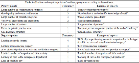 CONCLUSÕES: A percepção dos residentes em cirurgia plástica dos serviços credenciados do Distrito Federal foi positiva no que se refere a grade curricular do programa, estrutura para atendimento e desempenho da preceptoria. Quanto aos pontos negativos, foram apontados abrangência e distribuição da grade curricular, falta de atendimento de emergência, menor treinamento em procedimentos de natureza reparadora e reduzido em estágios de outras áreas, além de acervo bibliográfico insatisfatório e pouco incentivo à pesquisa. Dentre as sugestões de melhoria dos programas de residência médica, foram apontados, principalmente, a necessidade de aumentar a abrangência e o intercâmbio entre os serviços e o incentivo à produção científica.