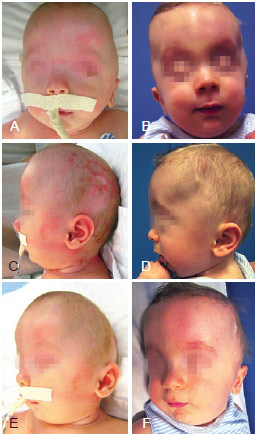 Figure 3 - Patient with oxycephaly. In A, C, and E, preoperative appearance on frontal, lateral, and left oblique views. In B, D, and F, appearance in the fifth postoperative month: frontal view in frontal, lateral, and left oblique views.