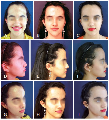 Figure 5 - Patient with turricephaly. In A, D, G, preoperative appearance from the frontal, right lateral, and right oblique views. In B, E, H, appearance in the eighth postoperative month from the frontal, lateral right, and right oblique views. In C, F, and I, appearance in the first month after removal of springs in the frontal, right lateral, and right oblique views.