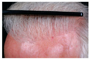 Pictures are very important for evaluating the new hairline, baldness area, and postoperative results. Images are obtained while the patient is in a seated position with the head at a 45-degree angle. Pictures are obtained from the front, right, and left sides and from the crown area, and a close-up is obtained, if necessary. Postoperative pictures are obtained at 8 months and at 12 to 15 months after the procedure for men and women, respectively, at the same views and angles of the preoperative images. The anterior hairline should be irregular and asymmetrical18. The hairline is discussed with the patient in front of a mirror and the new irregular frontal hairline is drawn on the scalp, while maintaining temple recessions (Figure 1). Usually, the midpoint of the new hairline lies 8 cm from the glabella, in a VW irregular line up to the temporal recesses. The patient is given an explanation of the progressive nature of baldness and is informed that a second replacement procedure may be necessary. Honesty will increase the patient's confidence.