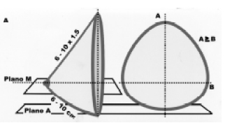 Figura 3A - Forma, projeção, diâmetros, dimensões e planos espaciais da mama no tórax. A proporção 1 do ápice do cone ao sulco e 1,5 do ápice ao pólo superior é semelhante à descrita por Phidias (Phi), escultor da antiga Grécia, de 1:1,618 dita como áurea ou divina.