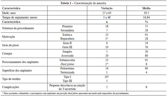 RESULTADOS: A média de idade das pacientes foi de 39,5 anos, 92% das cirurgias foram por motivação estética, 72% das cirurgias foram primárias e 80%, associadas. Em 24% dos casos, as pacientes apresentavam ptose grau II e em 76%, grau III. O período de seguimento variou de 3 meses a 48 meses. Duas (8%) pacientes apresentaram pequenos sofrimentos na junção do T-invertido, tratados de maneira conservadora. Não foram obervadas complicações como seromas, hematomas, necroses do complexo areolopapilar, infecções, perda dos implantes, tampouco foram necessárias reoperações por resultados insatisfatórios.