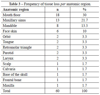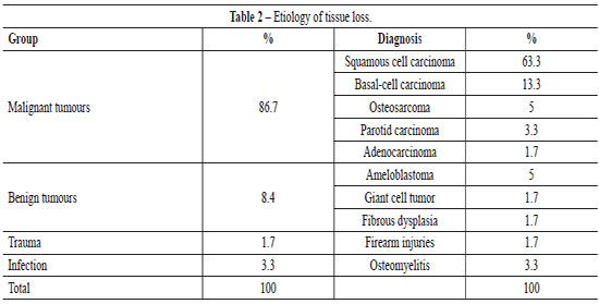 The etiology of the cases is presented in Table 2. Malignant tumours were the most frequent etiologic group with 86.7% of the cases. Squamous cell carcinoma was the most common diagnosis, representing 63.3% of the cases. The anatomic regions of the neoplasia are shown in Table 3. On the other hand, Table 4 shows the microsurgical flaps that were performed. In the reconstructions with fibula, a skin island was used in 13 of the 22 cases (59.1%).