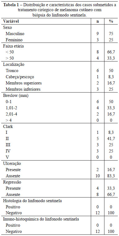 METHOD: A total of 12 cases were studied between March 2009 and March 2012. The treatment protocol followed criteria established by the Brazilian Group of Melanoma. Patients were evaluated for age, sex, thickness of the primary lesion, localization of drainage site of the sentinel lymph node, and presence of metastases.