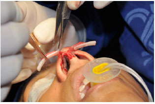 Resection of the caudal excess allowed avoidance of irregularities at the alar rim9. Total detachment of the lateral crura and the dome was performed (release of the vestibule's skin) to exposure them (Figure 4 and 5). Next, a "columellar strut" was fixed between the two medial crura to maintain tip support. In cases of very weak and/or short lateral crus, a cartilaginous graft was added for support ("lateral crural strut graft") (Figure 6).