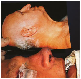 Figura 13. Resultado do tratamento da Columela Pendente. Caso severo de Columela Pendente. Tratamento com abordagem da soma das técnicas acima descritas devido à complexidade do caso. Utilizamos as abordagens "direta e indireta" de Randall e adaptamos uma ressecção parcial da Crux Medialis com sutura para tratamento da convexidade característica da Columela Pendente, modificando os conceitos de Armstrong e Joseph.