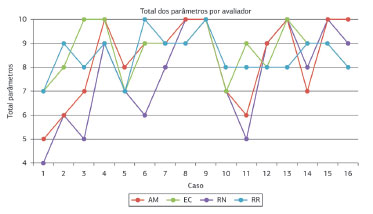 Figura 14. Gráfico dos escores totais de cada caso por avaliador. A linha vermelha representa as notas atribuídas pelo avaliador AM (Anna Martins), a linha verde pelo avaliador EC (Eduardo C. Chem), a linha lilás pelo avaliador RN (Rafael Netto) e a linha azul pelo avaliador RR (Ronaldo Righesso).
