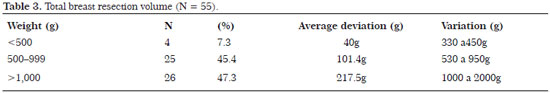 In several studies, the technique of choice varies by surgeon experience and service protocol. The two techniques used in this study showed satisfactory results13. Choosing the technique of Pitanguy9 as a reconstructive procedure was also reported in another study16. The choice of using both techniques was made in cases of the resection of large amounts of breast content to increase the odds of satisfactory results. The average tissue resected in the study published by Ronconiet al.15 was 800 g per patient, whereas that in this study was 950 g.