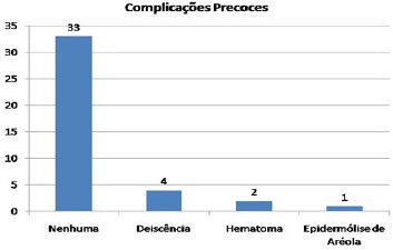 Complicações pós-operatórias recentes foram a deiscência do ponto médio da vertente: 04 pacientes, hematoma: 02 pacientes e epidermólise de aréola: 01 paciente (Figura 4). O Tempo de internação variou de 24 a 48 horas, 32 e 8 pacientes, respectivamente. O tipo de Anestesia predominante foi a anestesia geral, 25 pacientes, seguido da peridural com sedação, 13 pacientes, e peridural com geral, 02 pacientes.