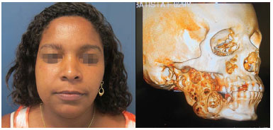 In case 2, there was a severe panfacial fracture sequelae with practically a complete absence of the entire right zygomatico-orbital complex. It is a defect with difficult anatomical comprehension, in which we considered that prototyping would be useful to define more adequate surgical planning. The presence of the prototype in the surgery room also helped to more quickly and more accurately identify the zygoma piece that was loose between the soft parts of the patient at the level of the alveolar process of maxilla. The dislocated zygoma ascended as a free graft to its original location and reconstruction was completed using external parietal table grafts and rigid internal fixation. Having the view of the model and surgical field at the same time in the trans-operative period was a critical factor to conduct our work.