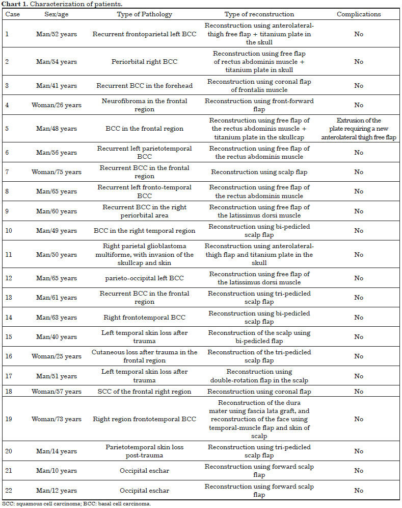 CONCLUSION: Various techniques can be used to reconstruct the scalp and forehead; each case should be assessed individually. The present study indicated that flaps are safe and that they confer low morbidity at the donor area. These results were satisfactory and in agreement with the literature analyzed.