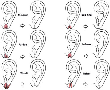 There are numerous lobuloplasty methods (Figure 9)1,5,7. McLaren8 first approached the subject in a four-case report. He addressed the problem by simple linear suturing after freshening of the cleft edges and scar excision under general anesthesia2. Boo-Chai6 reported congenital and acquired clefts, and designated congenital clefts as "coloboma lobuli." In contrast to McLaren, Boo-Chai performed outpatient surgeries with local anesthesia. The technique consisted of excising the cleft edges, only leaving epithelium in the apex, wherein a rod was placed. Then, the cleft was closed linearly below the rod to redo the hole; 3 weeks later, the rod was replaced with an earring2,5,6,9.