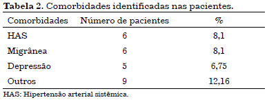 Foram encontradas comorbidades em 35,11% (26) das pacientes, sendo hipertensão arterial sistêmica (HAS) (8,1%), migrânea (8,1%) e depressão (6,75%) as mais frequentes (Tabela 2).