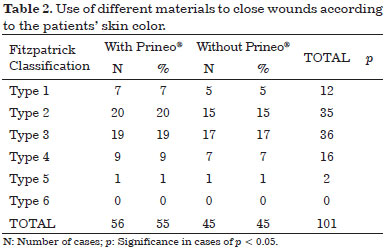 The quality of a scar depends on racial characteristics, such as color and thickness of the dermis; usually, better scarring, from a cosmetic perspective, occurs in patients with lighter skin12. In this study, the skin color and thickness were homogeneous in both groups (Tables 2 and 3; Figure 3). Furthermore, considering hyperemia, hyperchromia, depressions, seroma, and dehiscence, there was no difference in the final quality of the scar between the groups (p > 0.05; Table 5). However, the thickness of the dermis around the wound did influence the final outcome of the scar (p = 0.001; Table 3).