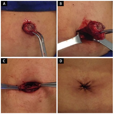 Figure 1. A: Circular excision of endometrioma with surgical margin; B: Block exeresis and umbilical cord; C: Viewing of subjacent aponeurosis; D: Synthesis of skin aponeurosis in the skin with small central bloody area.