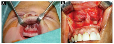 To treat the palate and maxillary crest, the author chooses access by an incision in the gingivolabial sulcus, which provides extensive exposure of the structures7-9.