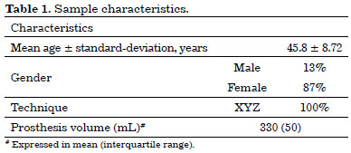 The responses of 23 patients were analyzed. Nine of the 32 patients initially scheduled were not found by the research team through identification data obtained from hospital records. Table 1 shows a sample profile, with the patients' relative clinical features and the surgical technique used. Mean age was 45.8±8.72 years and 87% of the patients were women. The technique used was XYZ9 in all cases, with a prosthesis median volume of 330 mL (interquartile range: 50).