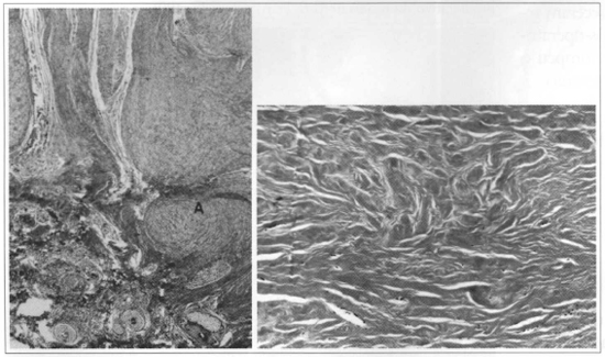 Fig. 1 - a) Before treatment, observe the nodular arrangement of collagen fibers (A). Gomori stains (x40). b) After use of bleomycin, note marked hypocellularity, hyalinization and disorganization of connective tissue in the central part of the keloid. Gomori stains (x100).