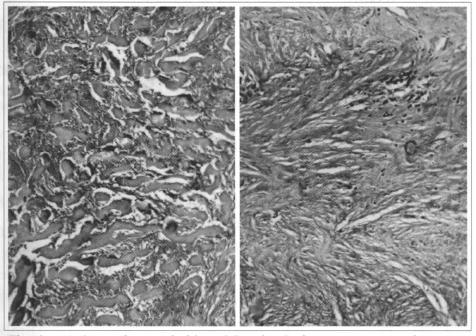 Hypocellularity especially identified by absent nuclei, marked hyalinization of collagen bundles, absent elastic and reticular fibers in 100% of the cases, reduced interstitial acid mucopolysaccharides, as well as modified proliferative pattern of fibrous tissue in nine cases, are morphological evidences of the major alteration produced in the structural aspect of the lesions after treatment. Moreover, they correlate with softening of hardened texture, usually observed in these lesions.