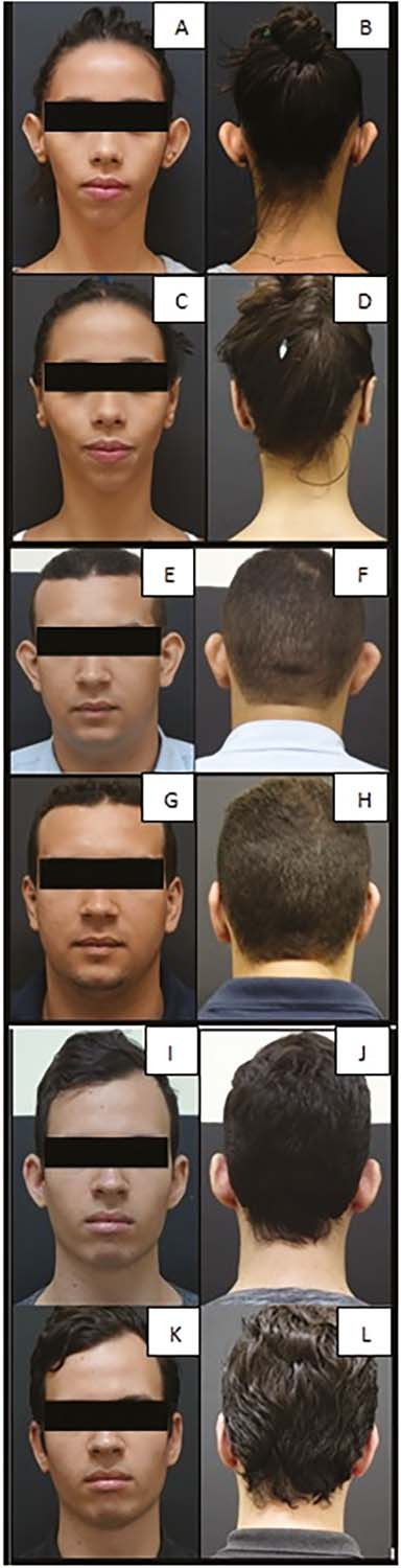 Figura 6 - Pré-operatório e pós-operatório. Em A, C, E, G, I e K vista anterior. Em B, D, F, H, J e L vista posterior.