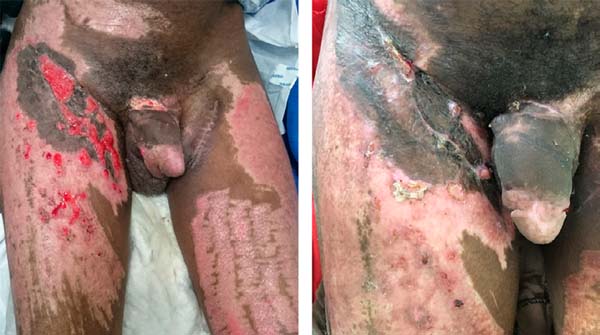 À admissão, possuía ferida profunda em região suprapúbica, com fundo necrótico, deposição de fibrina e secreção purulenta, em continuidade com desenluvamento da haste peniana (Figura 2) - houve avulsão do revestimento cutâneo anterior do pênis, com preservação da glande. Apresentava também ferida escoriada superficial em face anterior da coxa esquerda, com cerca de 10cm x 15cm, já com sinais de restauração, e ferida extensa em face anterior da coxa direita, aproximadamente 15cm x 25cm, com perda de substância, deposição de fibrina e necrose central.